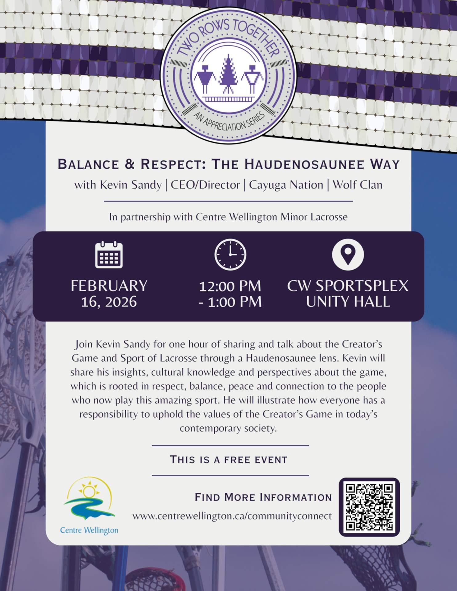 Centre Wellington Minor Lacrosse is honoured to partner with the Township in supporting Two Rows Together – An Appreciation Series, featuring Kevin Sandy, CEO/Director of the Cayuga Nation (Wolf Clan).